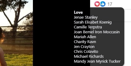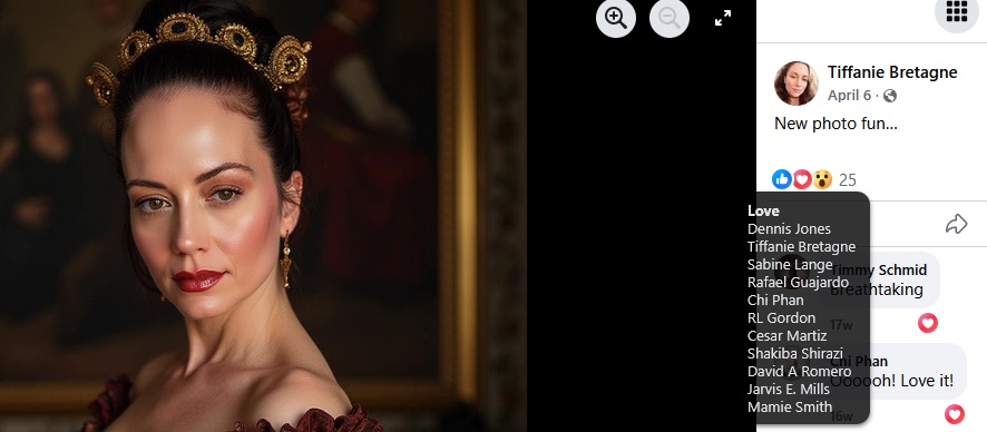 Tiffany Bredfeldt, today apparently divorced, maintains a Facebook page under the alias “Tiffanie Bretagne” on which she publishes digitally idealized images of herself, in one instance as royalty. This image is hearted by Tiffanie Bretagne. Jen Crayton’s mother-in-law posts flattering remarks there.